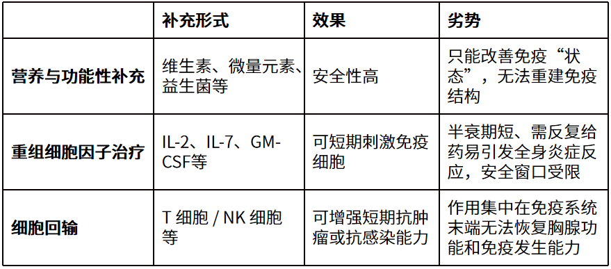 这些策略的共同特点是:在既有、已老化的免疫系统中“加东西”,而不是让系统重新生长。